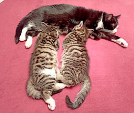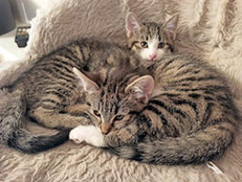 „Sissi“, getigert, links im Bild, junge Mutter von „Pipo“, sehr
